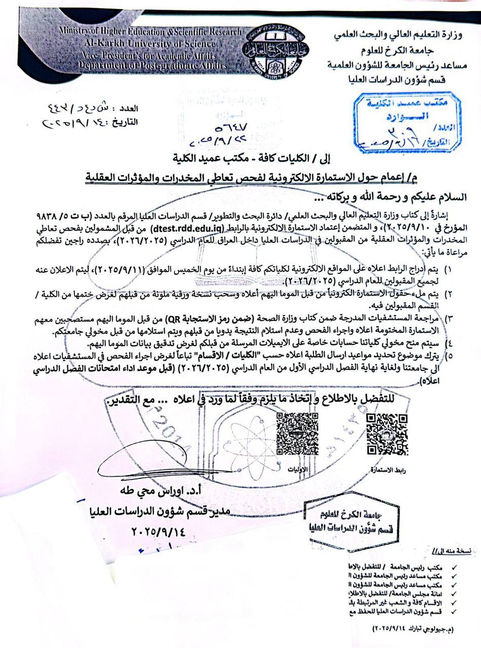 تعلن كلية علوم الطاقة والبيئة وبناءً على توجيهات وزارة التعليم العالي والبحث العلمي، عن ضرورة قيام جميع الطلبة المقبولين في الدراسات العليا بإجراء فحص تعاطي المخدرات والمؤثرات العقلية، وذلك من خلال الاستمارة الإلكترونية المخصصة لهذا الغرض.