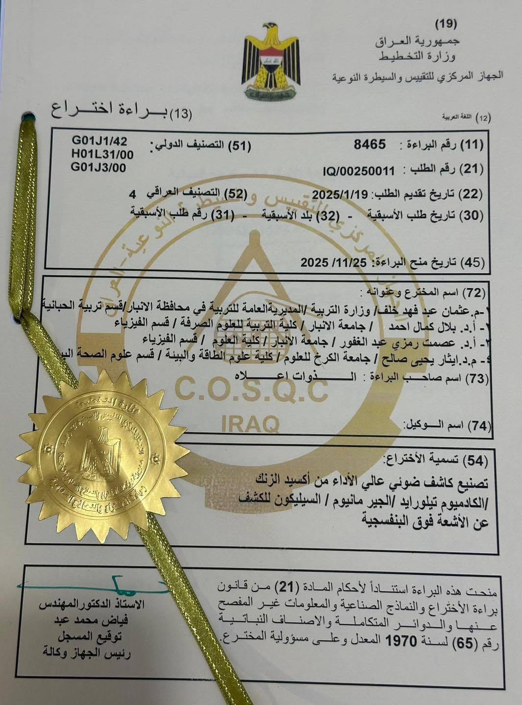 وتتناول البراءة تصنيع كاشف ضوئي عالي الأاء للكشف عن الأشعة فوق البنفسجية، وهو ابتكار يسهم في تطوير تقنيات الاستشعار الضوئي وتعزيز كفاءة الكشف للتطبيقات البيئية والعلمية.